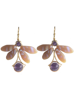 Art nouveau influenced floral design made with irridescent striped matt topaz glass colored "petals" with brass and amethyst bead accents on 22K vermeil lever back earring fixtures.