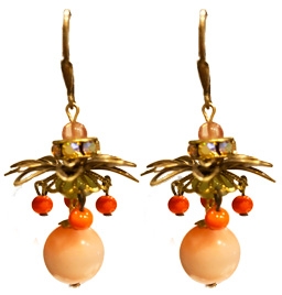 Spritely pineapple design made with irridescent rhinestone rings, brass findings, '60's powder pink drops, '50's bright orange glass dangles and cherry quartz top accents on 22K vermeil lever back fixtures. 1.5"L x 1"W