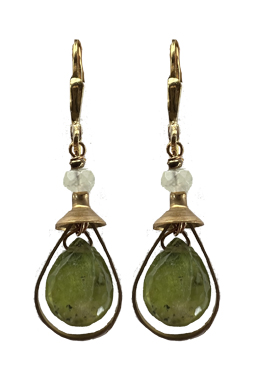 Mod, light-weight olive green garnet teardrop surrounded by brass and faceted prehnite bead on 22K vermeil lever back earring fixture.