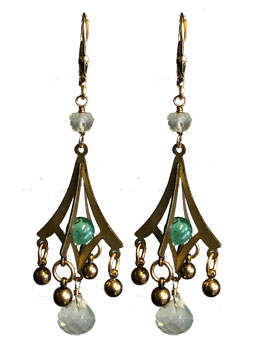 Mid century modern chandelier findings with prehnite drops and vintage glass and brass accents on 22K vermeil lever back earring fixtures. 1.75"L x 1"W