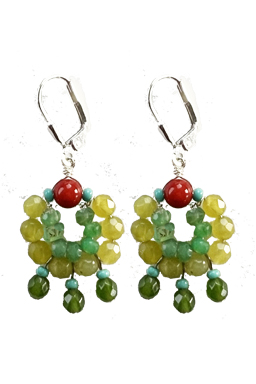 Colorful mix of faceted chryscolla, olive jade, red coral, Taiwan jade and with seed bead accents on sterling silver lever back earring fixtures.