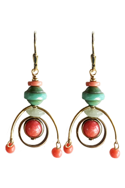 Mid century modern dangly design made with pale coral, aventurine and vintage plastic accents, glass beads and brass findings on 22K vermeil lever back earring fixtures.