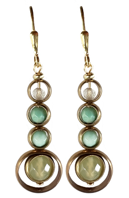 Modern, naturalistic, super-light mix of faceted prehnite & chryscolla with brass rings on 22K vermeil lever back earring fixtures.