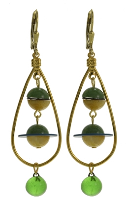 Space-Age earring made with aventurine and yellow jasper beads split by African resin discs (largest disc is slate blue--not viewable in photo) dangling within a '70's teardrop metal frame with 1930's glass drops on 22K vermeil leverback earring fixtures. 2.5"L x .75"W