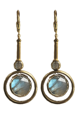 Faceted labradorite surrounded in vermeil bezels with brass and faceted pyrite on 22K vermeil lever back earring fixtures.