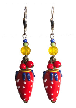Bright fruity glass strawberry with vintage glass dangles on sterling silver lever back earring wires. 1.5"L x .5"W