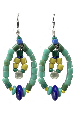 African glass beads in aqua, green, yellow and blue with faceted prehnite center drops on sterling silver lever-back earring fixtures.