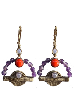 Modern tribal motif with African brass, faceted amethyst & opalite beads, '40's-'50's glass accents on 22K vermeil lever back earring fixtures.