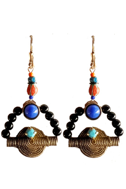 Modern tribal motif with African brass, onyx and 30's, '60's and new glass accents on 22K vermeil lever back earring fixtures.