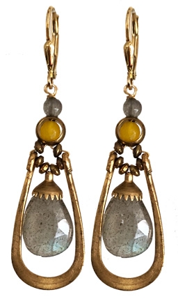 Vintage brass hoop with faceted labradorite centerpiece and yellow new jade, brass and labradorite accents. 1.75"L x .75"W