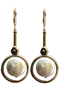 Freshwater pearls surrounded in vermeil bezels with brass and faceted pyrite on 22K vermeil lever back earring fixtures.