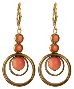 Mod arrangement of brass hoops surrounding pale coral beads on 22K vermeil lever back earring fixtures. 1.75"L x 1.25"W