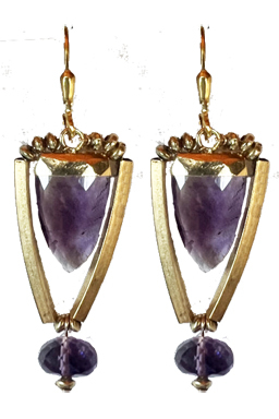 Contemporary design with faceted amethyst gemstones with brass bars and 22K vermeil bezel and leverback earring fixtures.