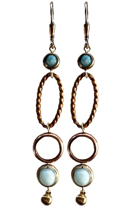Elegant shoulder duster with vintage and new brass hoops with amazonite beads on 22K vermeil lever back earring fixtures.