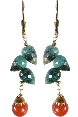 Faceted chrysocolla with coral colored stone drops and brass caps on 22K vermeil lever back earring fixtures.