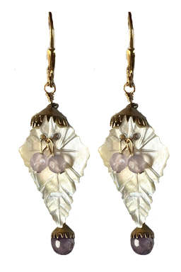 Vintage-vibe design with pale blue vintage mother of pearl cut out leaves topped by a brass cap with faceted pale amethyst dangles and faceted amethyst drops.