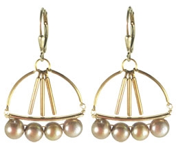 Very wearable, light-weight brass sticks with freshwater champagne colored pearls on 22K vermeil leverback earring fixtures. 2"L x 2"W