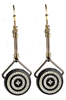 Jet and inlayed crystal deco glass on vintage brass findings on 22K vermeil lever back earring fixtures.