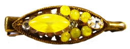 Vintage brass finding is topped by 1940's-'60's bright glass stones & rhinestone on antiqued bronze toothed hair clip to pin up a bit of hair. 1.75" L x 1" W