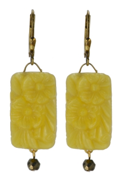 1940's Japanese yellow floral relief glass tops with faceted pyrite drops on sterling silver lever back earring fixtures. 1.5" L x .75" W
